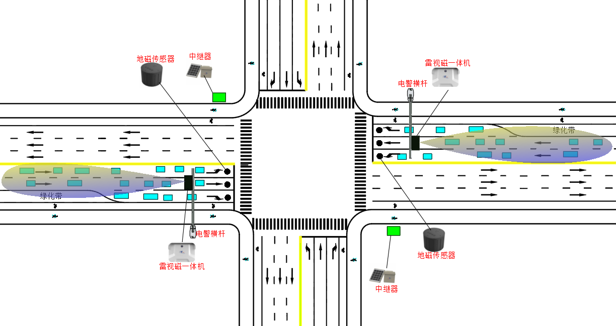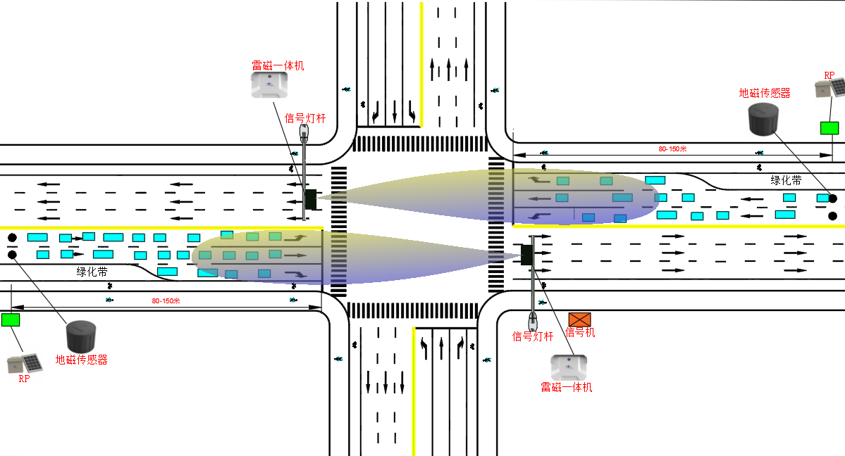 当一些交通信号控制方式需要用到排队数据时,为使雷视检测范围更远,会选择把雷视磁一体机装在进口道上方的电警横杆上,但电警横杆与停止线之间存在检测盲区,而如SCATS之类的信号控制系统需要停止线后1~3m的交通流数据,可将地磁放在停止线后以补充雷视盲区数据。