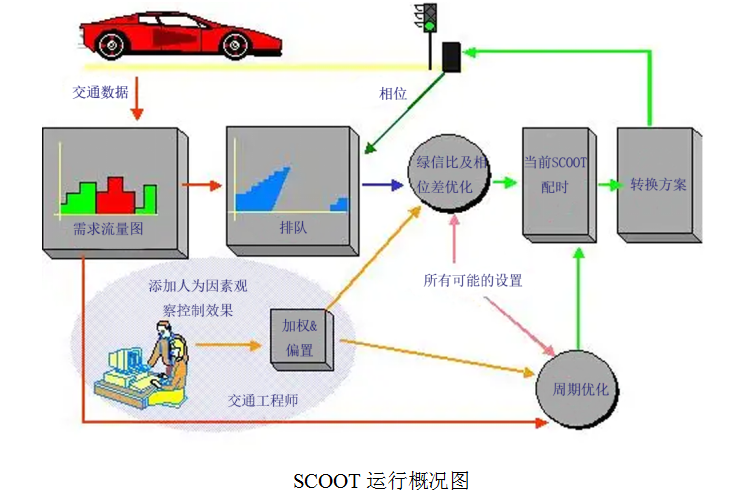 SCOOT即“绿信比-周期长-相位差优化技术”,是一种对交通信号网络实行实时协调控制的自适应控制系统,是一种方案生成式的控制系统。它能够通过安装于各个交叉口每条进口道上游的车辆检测器所采集的车辆到达信息,联机进行处理,形成控制方案,连续实时的调整绿信比、周期时长及相位差三个控制参数,使之与变化的交通状况相适应。SCOOT运行概况如下图所示: