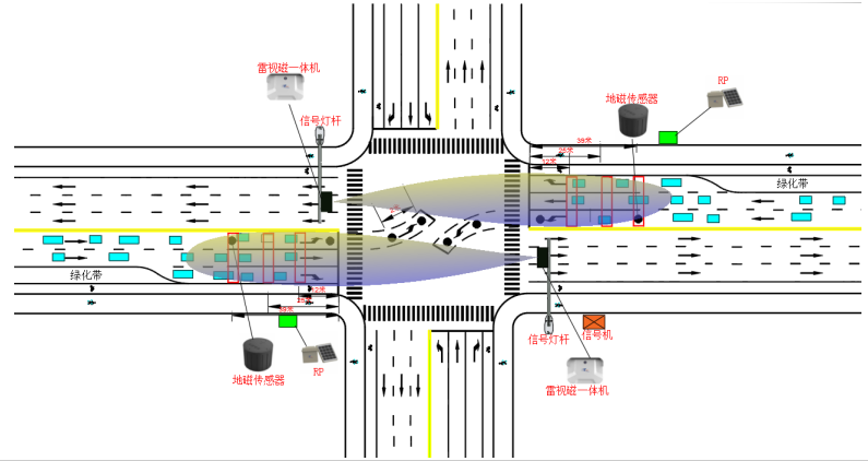 (1)路口四个方向的信号灯杆上各布设一台MPD093雷视磁一体检测器,并且将雷视磁一体检测器朝向来车方向。