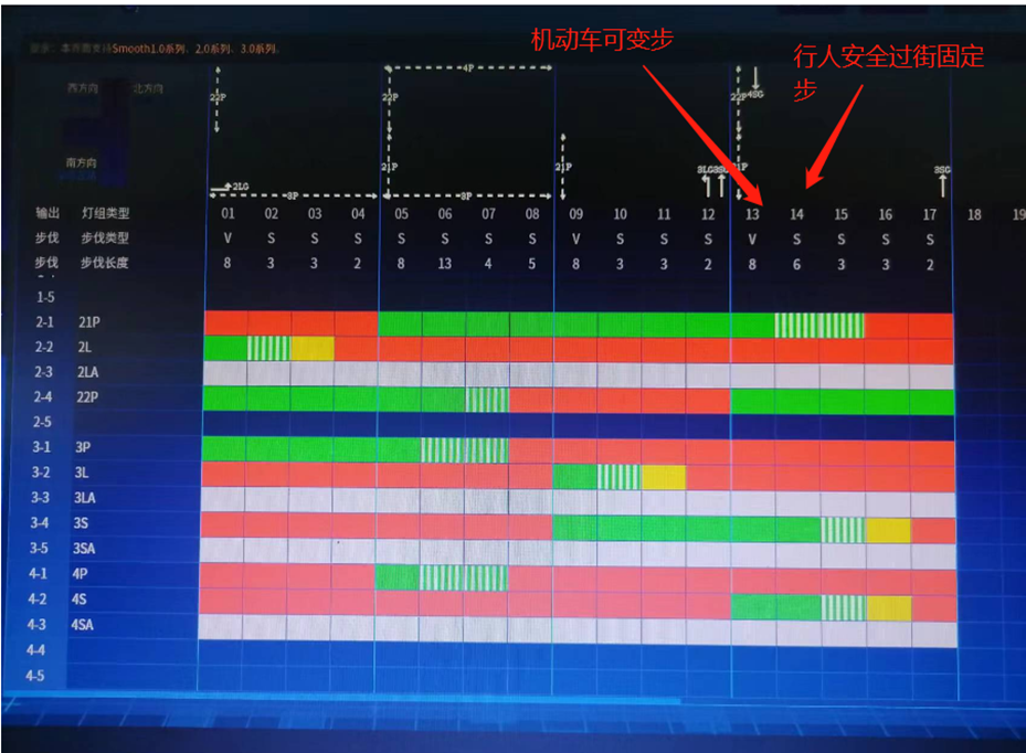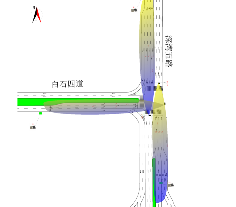 在深湾五路与白石四路运行机动车+行人感应混合控制,当机动车可变步运行完最小绿灯时间,检测到当前相位存在通行需求时,如机动车能在固定步绿灯时间完成则执行下一相位,否则延长单位绿灯时间,最大不能超过最大绿灯时间。当行人相位运行完最小绿灯时间时,若检测到存在行人通行需求,则增加行人单位绿灯时间,最大不超过行人最大绿灯时间,若没有检测到行人需求,则切换下一相位。