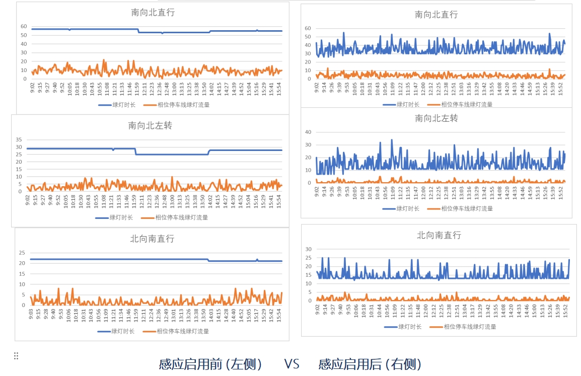 感应控制启动后,绿灯时长能随交通流量的变化而动态改变,有效减少了由于车流量波动的不确定性,而导致的绿灯空放和二次排队现象,交叉口通行效率得到明显提升。